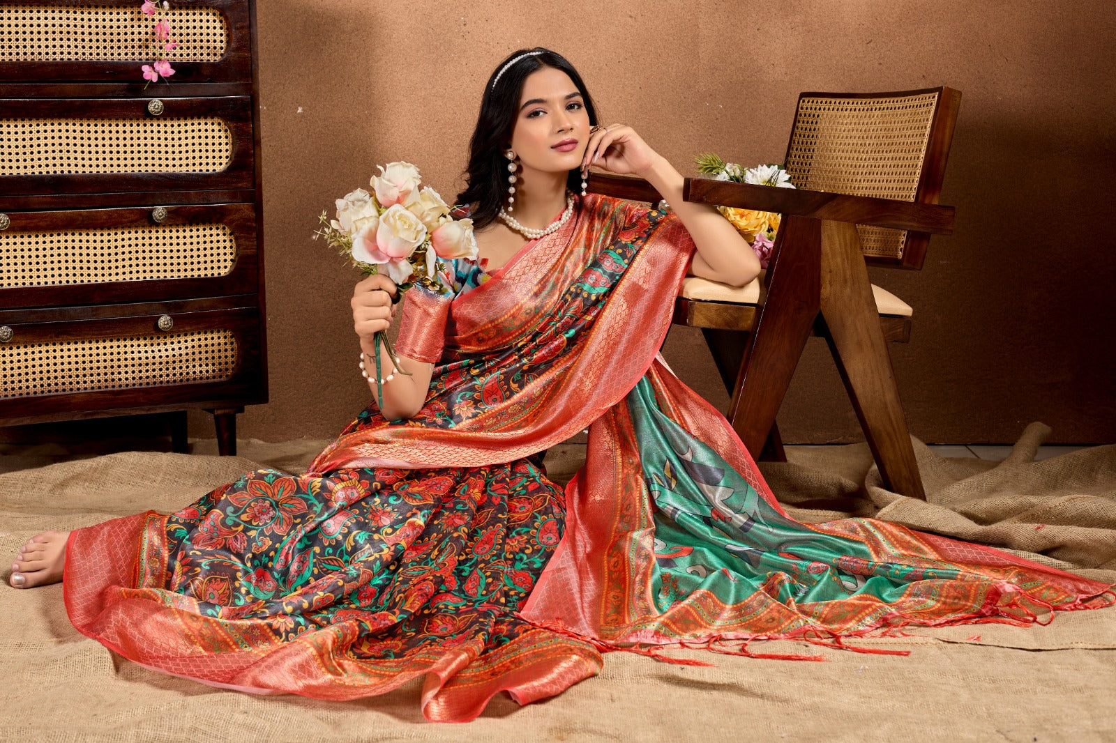 This stunning saree features a vibrant digital print that celebrates art and culture with its bold parrot motif and intricate floral patterns. Crafted from soft silk blend fabric, it drapes gracefully while offering a luxurious shine and smooth texture.