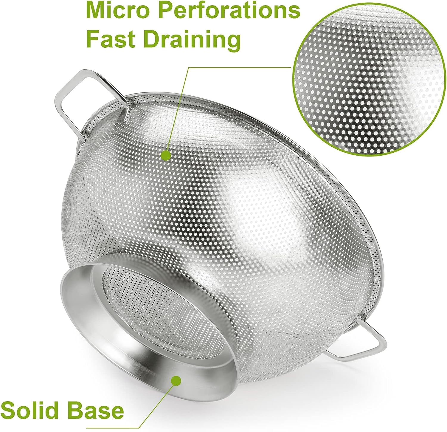 Tiny, closely spaced mesh holes let water and oil flow out quickly while keeping your food secure. Perfect for pasta, rice, potatoes, tomatoes, berries, and more. - 💪 Heavy-Duty 18/10 Stainless Steel